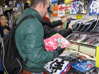 Of course the architecture itself is worth seeing, but walking along Nineizaka and Sanneizaka from Kiyomizu temple is also fun. There are many tiny shops. They found some interesting T-shirts at a shop. The pictures on the T-shirts are very popular items seen in TV or magazines coming with a bit different letters.